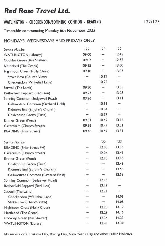 Service 122/123: From 06th November 2023 we will be operating a new Service from Watlington to Reading via Nettlebed, Stoke Row, Checkendon, Rotherfield Peppard and Kidmore End. This will Operate on Mondays, Wednesdays, and Fridays