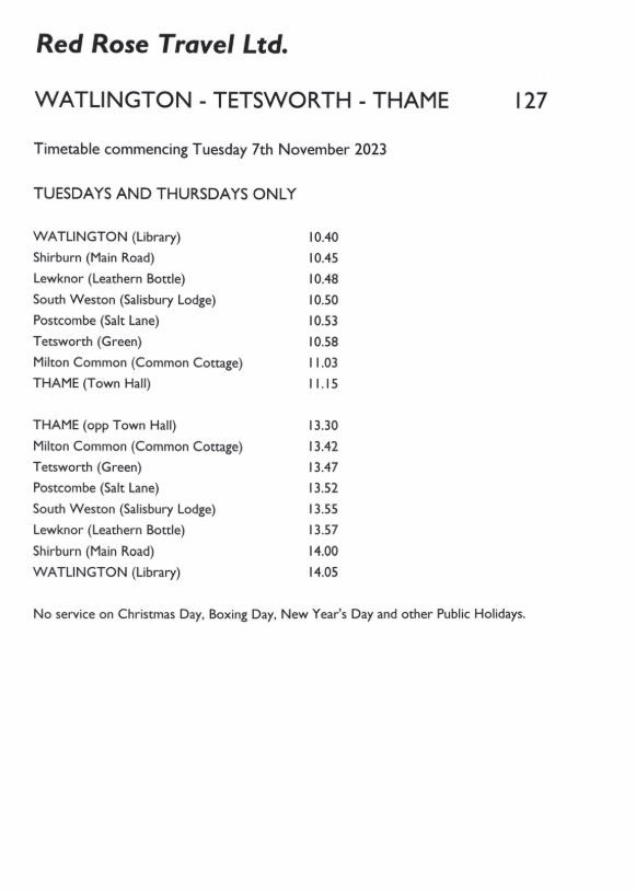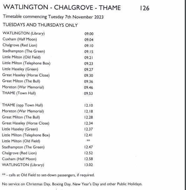 Service 126/127 Watlington to Thame via Lewknor, Postcombe, Tetsworth, The Miltons, Chalgrove, The Haseleys and Moreton. This will operate on Tuesdays and Thursdays